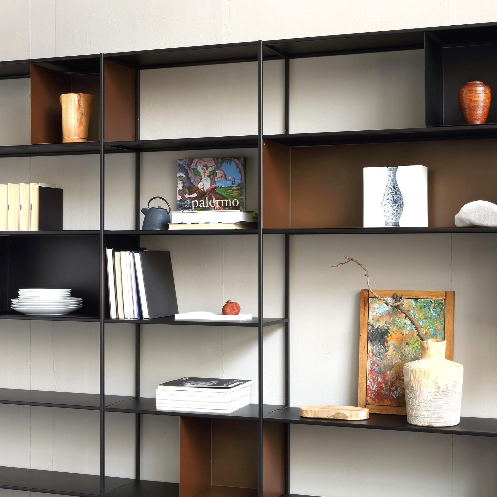 Modèle exposé en boutique : composition à 2 montants, 7 étagères et 1 caisson à porte abattante. Coloris mixte Copper black et Bronze (collector). Dimensions : L104 H226 P32 cm