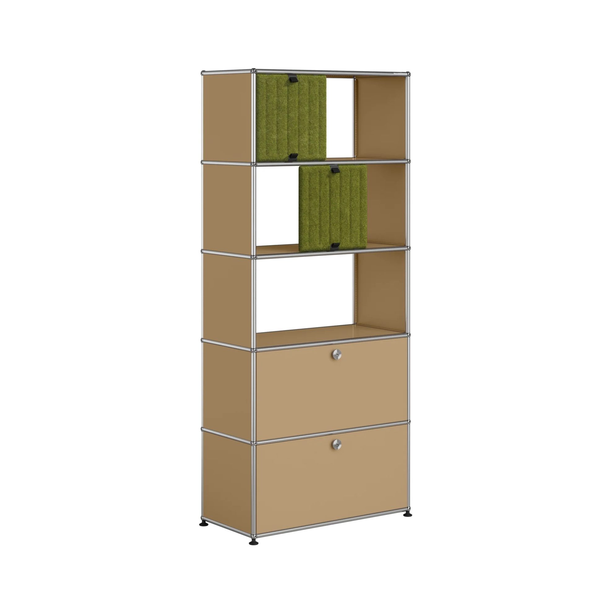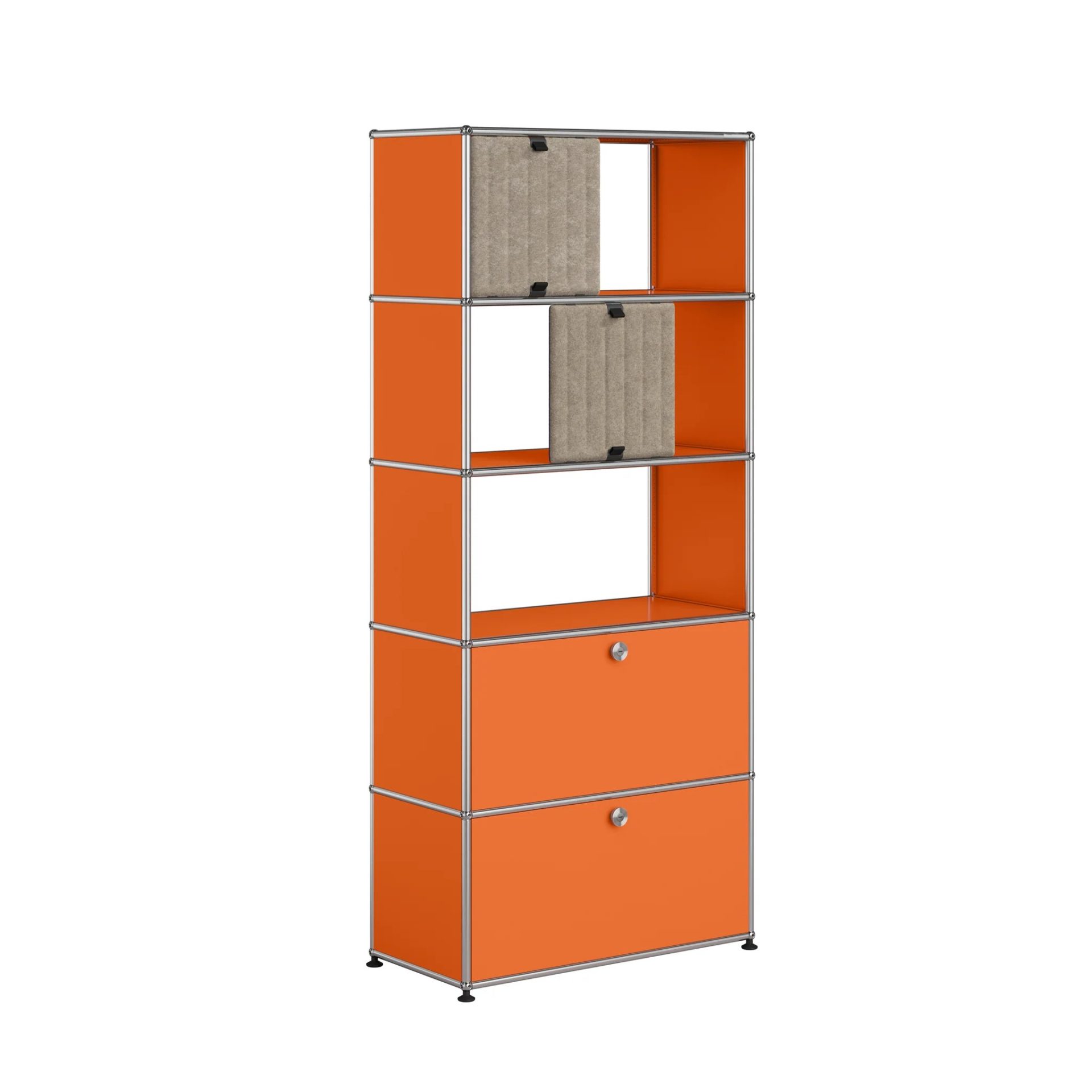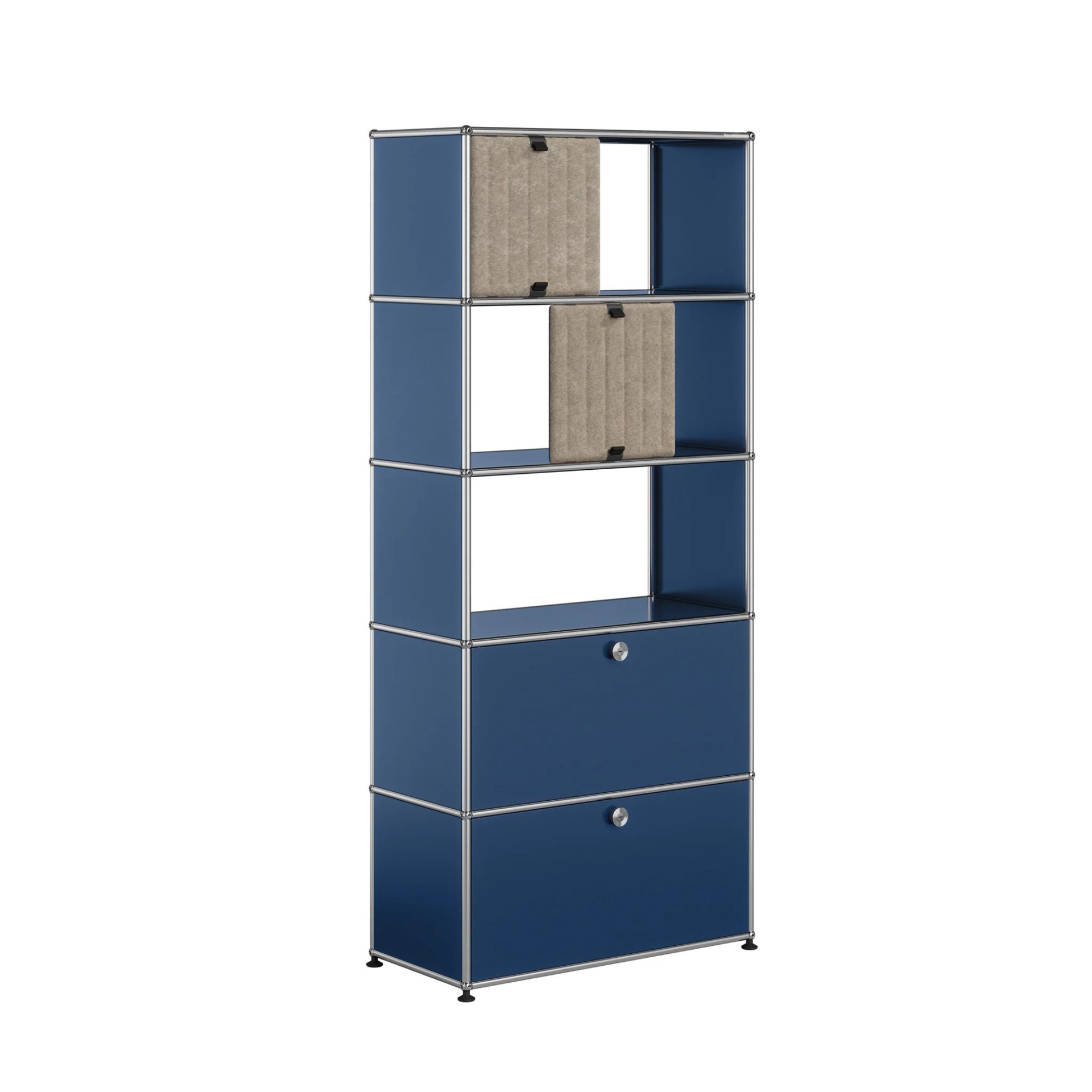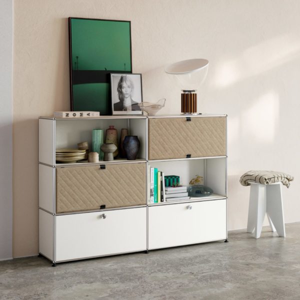 Bibliothèque à 5 casiers dont 2 équipés de portes métalliques et 2 équipés de portes Soft panels. Créés par un architecte et un industriel visionnaires, les meubles USM sont fabriqués en Suisse depuis plus de 50 ans et reconnus dans le monde entier. Leur qualité de fabrication et leurs lignes intemporelles en font un classique incontournable du design, qui trouve sa place aussi bien dans les bureaux que dans les plus beaux intérieurs, classiques ou modernes. Leur conception modulaire permet de les faire évoluer au fil du temps selon les besoins et les envies.