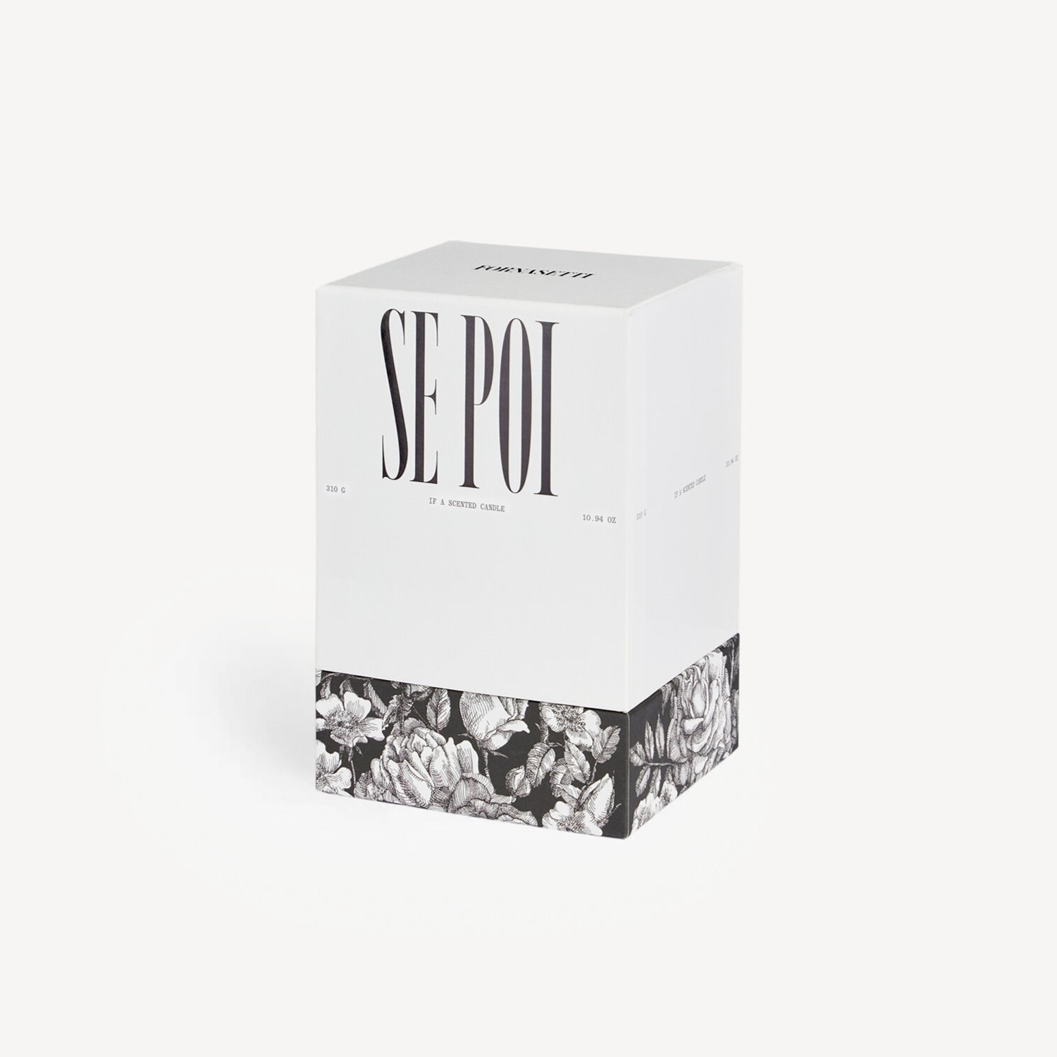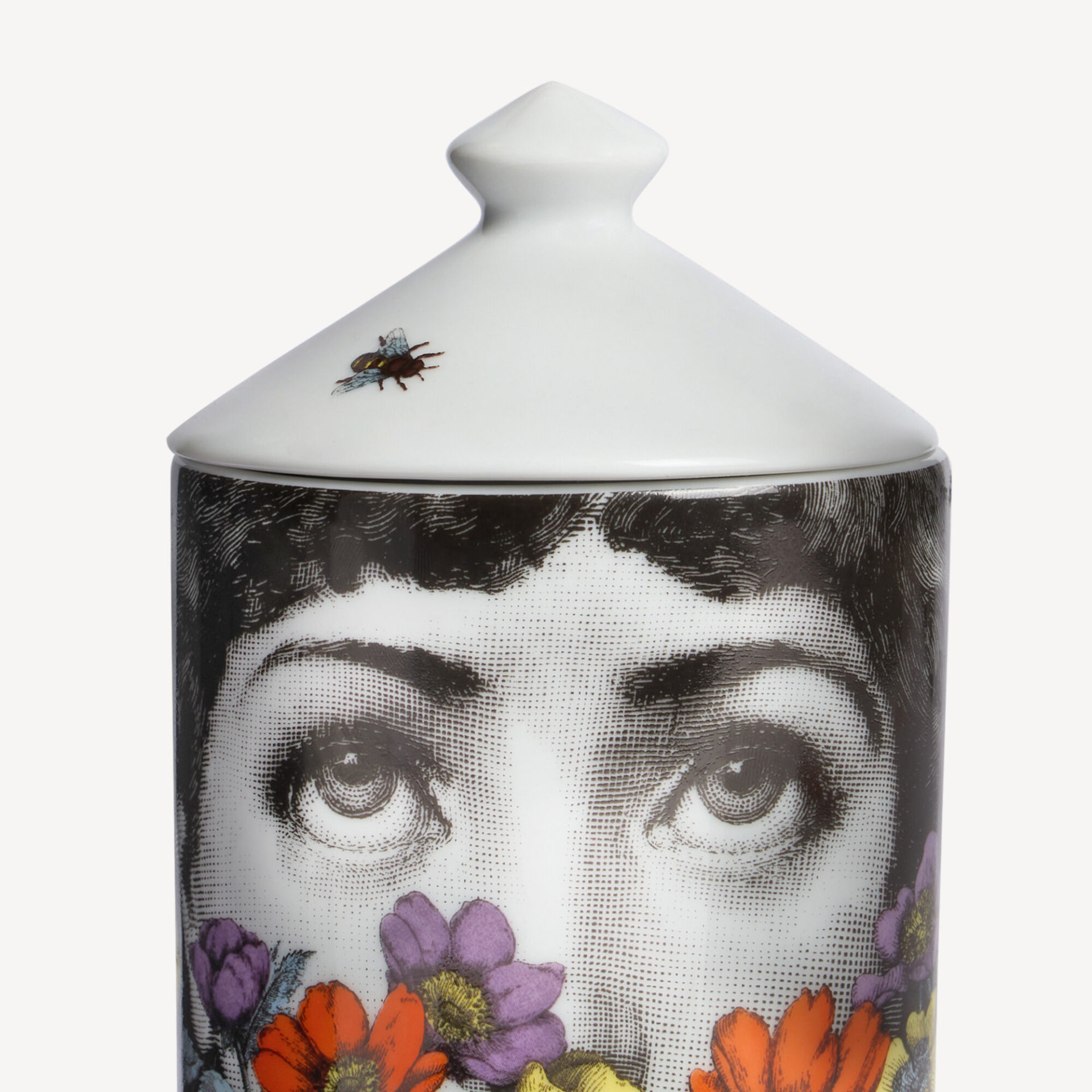 Bougie parfumée Fornasetti Se Poi Tra i Fiori. Corps en porcelaine, motif TRA I FIORI, BLANC/NOIR/COULEURS. Cire végétale parfumée "GIARDINO SEGRETO", 310g, 70h d'autonomie. Dimensions : L9 P7,5 H15 cm