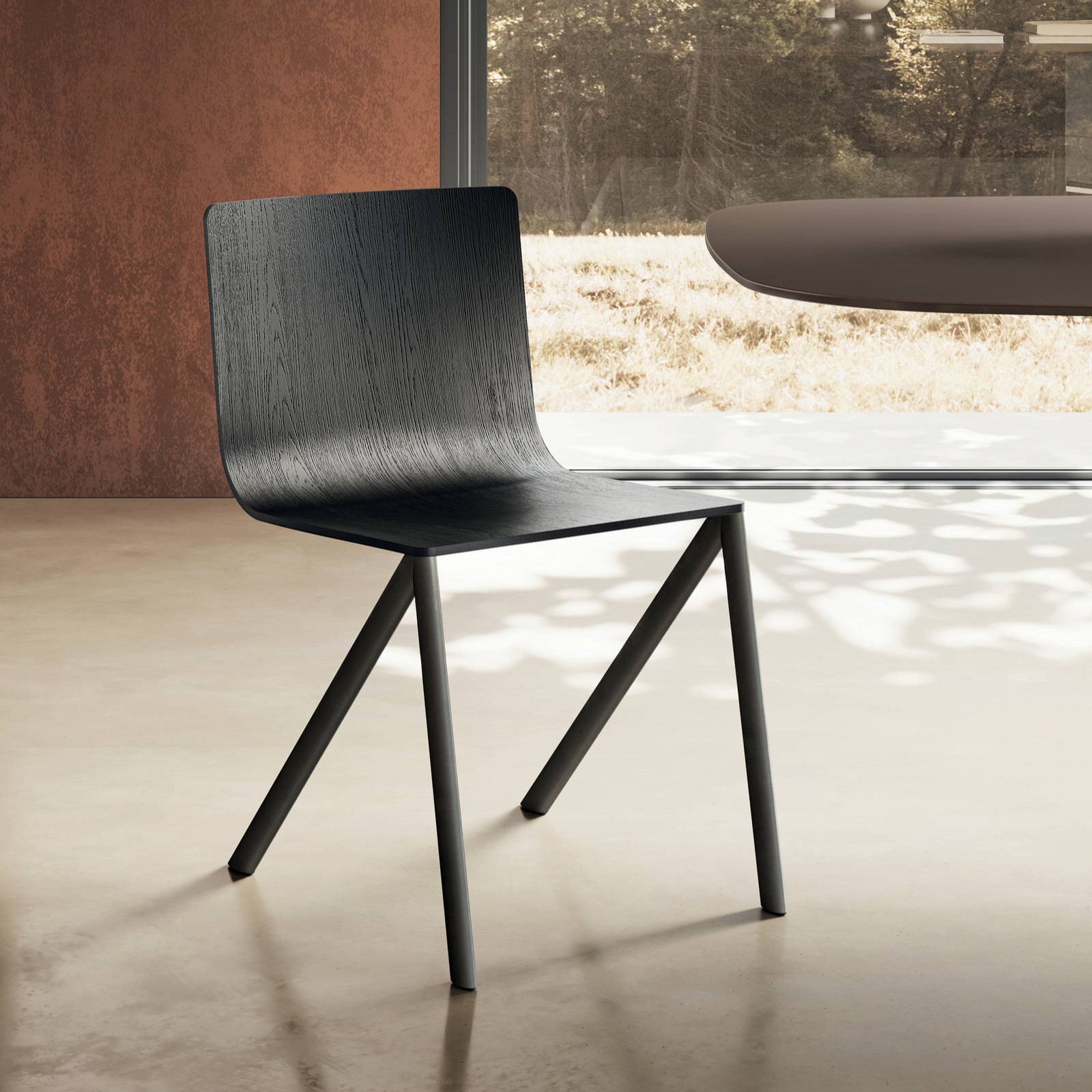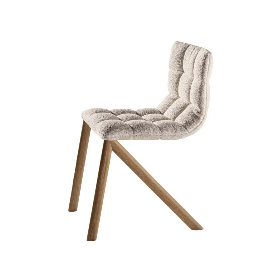 Chaise Lago Mezz'aria, design Daniele Lago. Modèle présenté : piétement bois Finewood Chiaro, structure capitonnée garnie de tissu Please col. 104. Dimensions : L46 P59 H78 cm