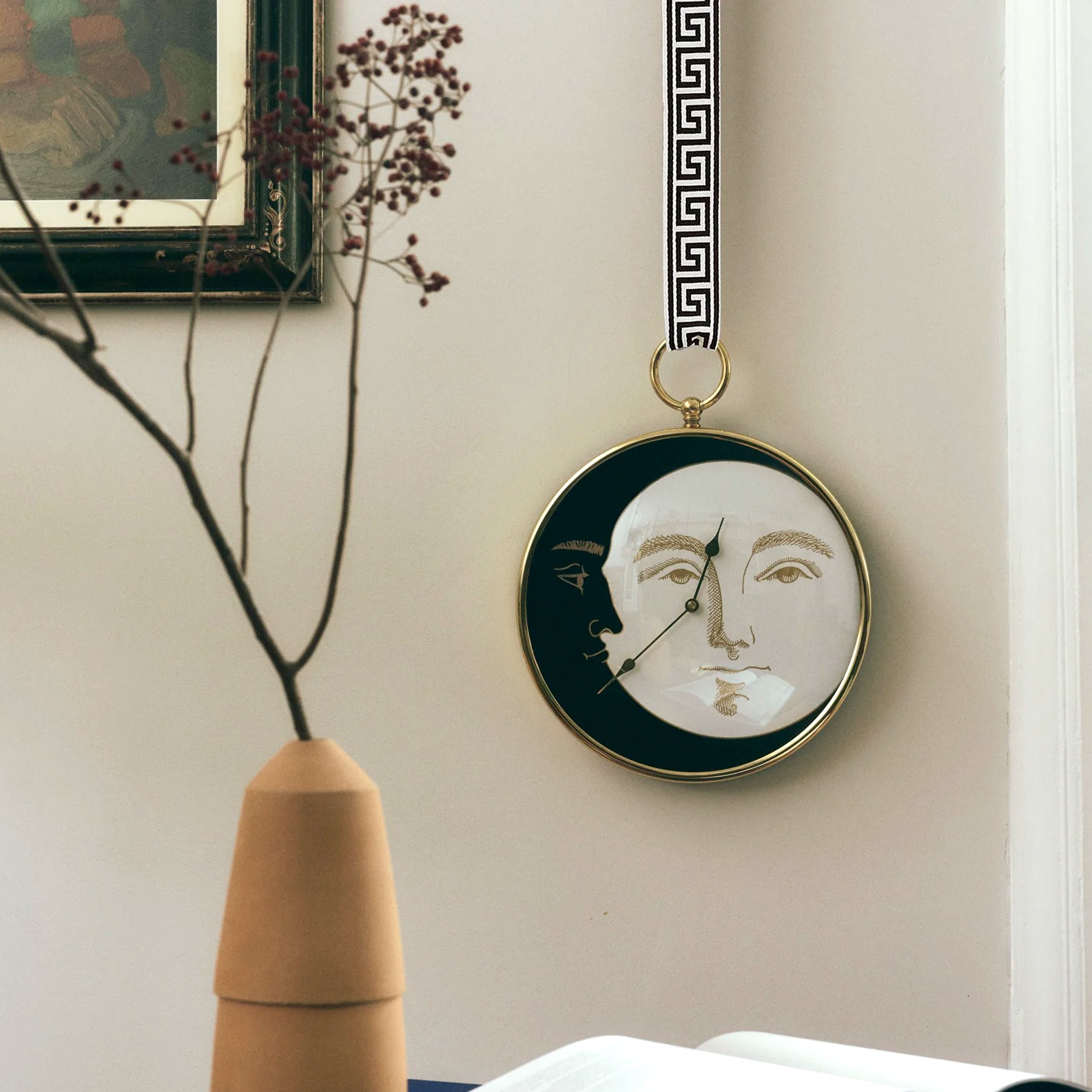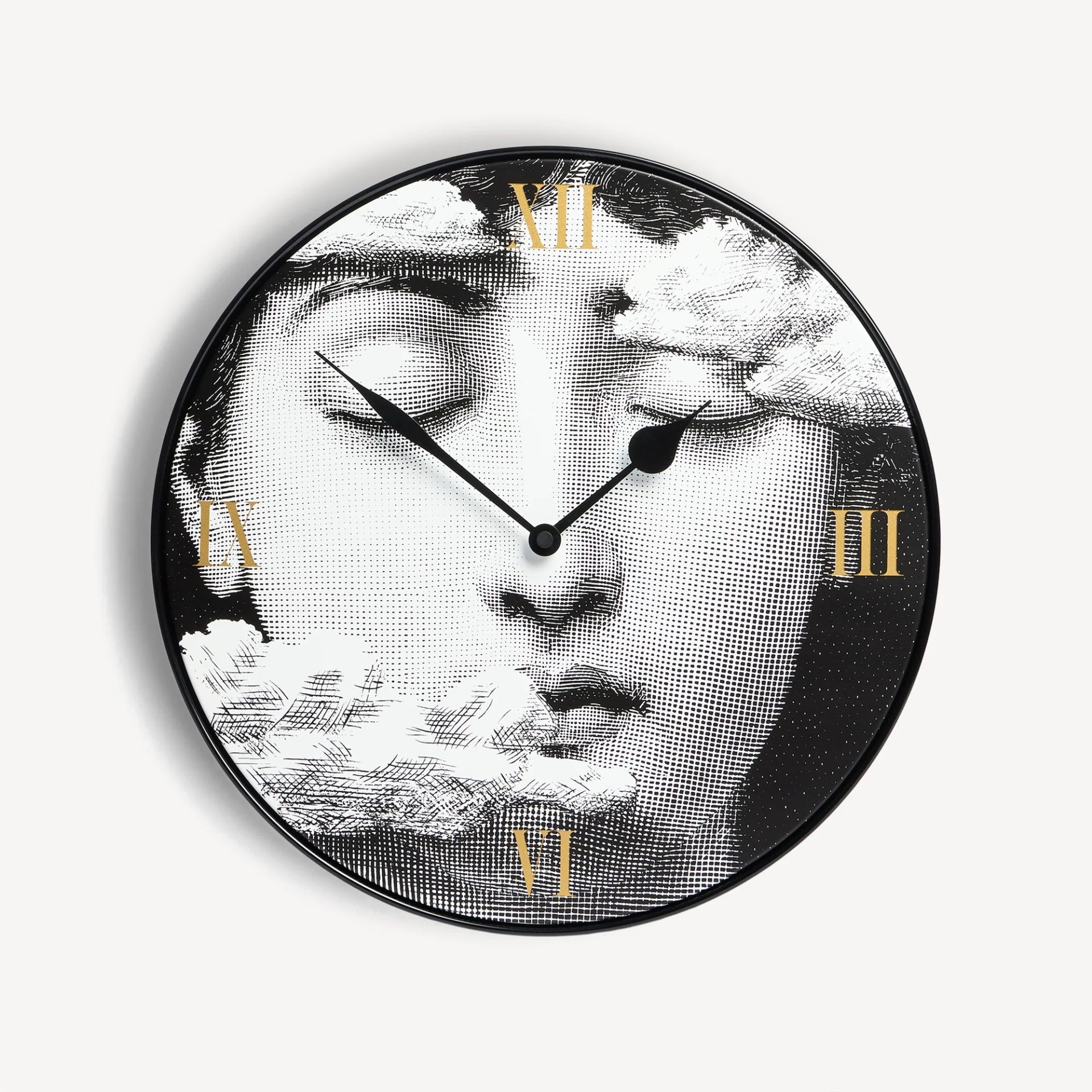 L'horloge murale Tra le Nuvole de Fornasetti présente un visage de la série Tema e Variazioni entouré de nuages, offrant une atmosphère onirique et intemporelle, avec un mouvement silencieux et continu et un boîtier en métal résistant décoré à la main. Les horloges Fornasetti se déclinent en un large choix de formes et motifs, à fixer au mur ou en versions à poser : nous consulter pour précisions et disponibilités.