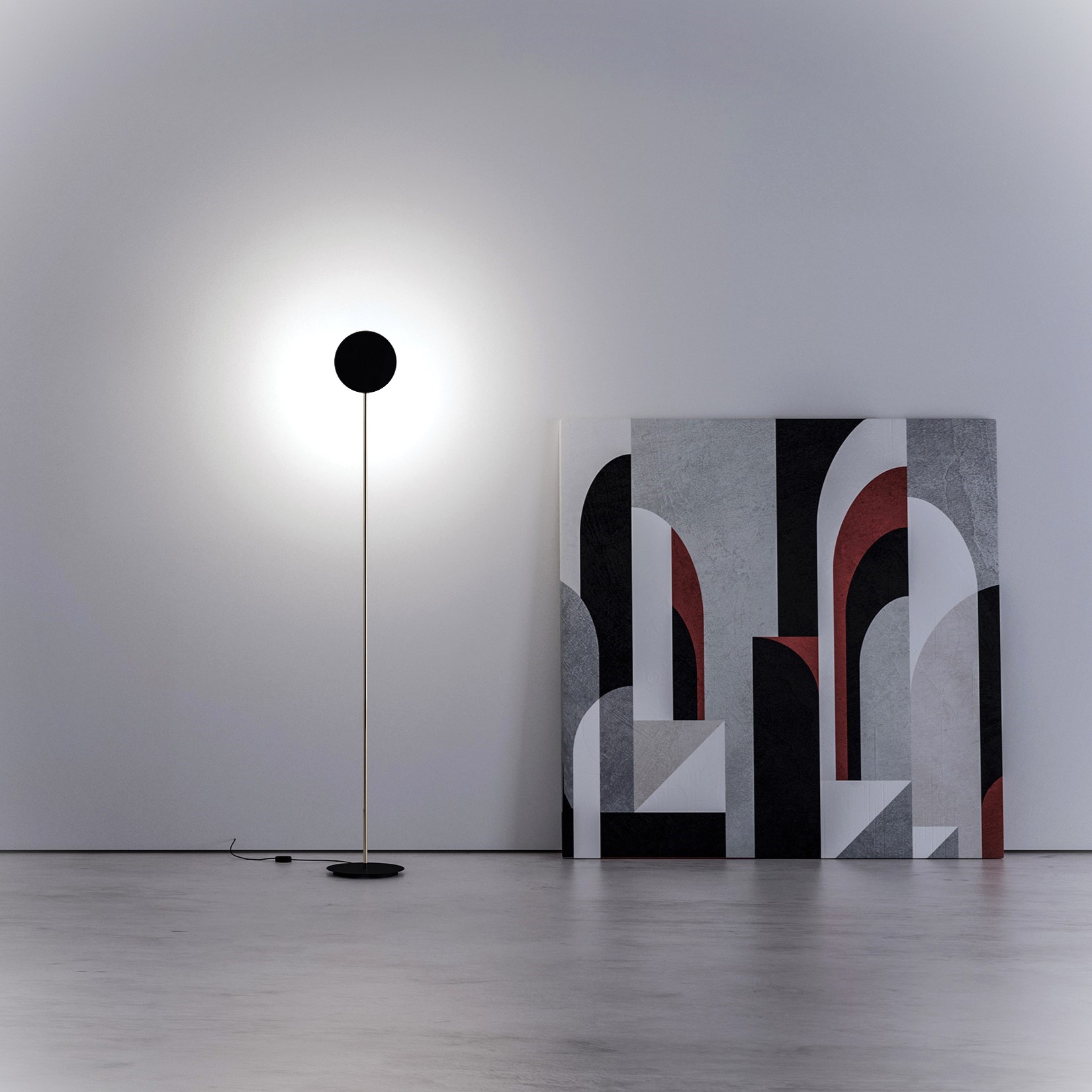 Lampadaire Stop, design Davide Groppi. Modèle présenté : Base et tête noir mat, câble noir, tige laiton finition OR POLI. Source : LED 28W 2700K 3335 lm CRI>90 dimmable. Dimensions : D30 H180 cm