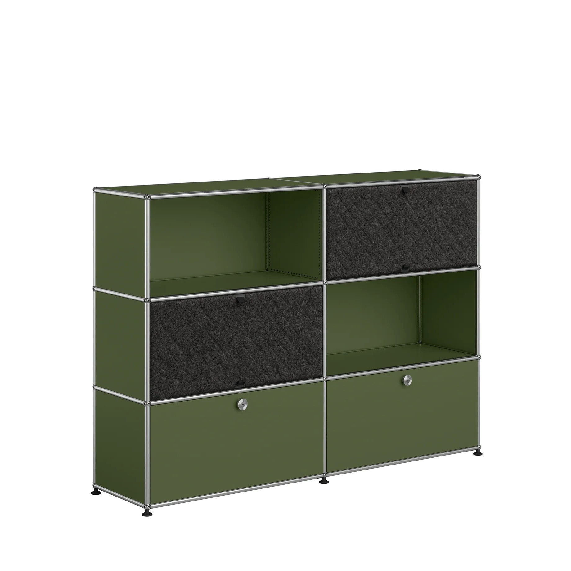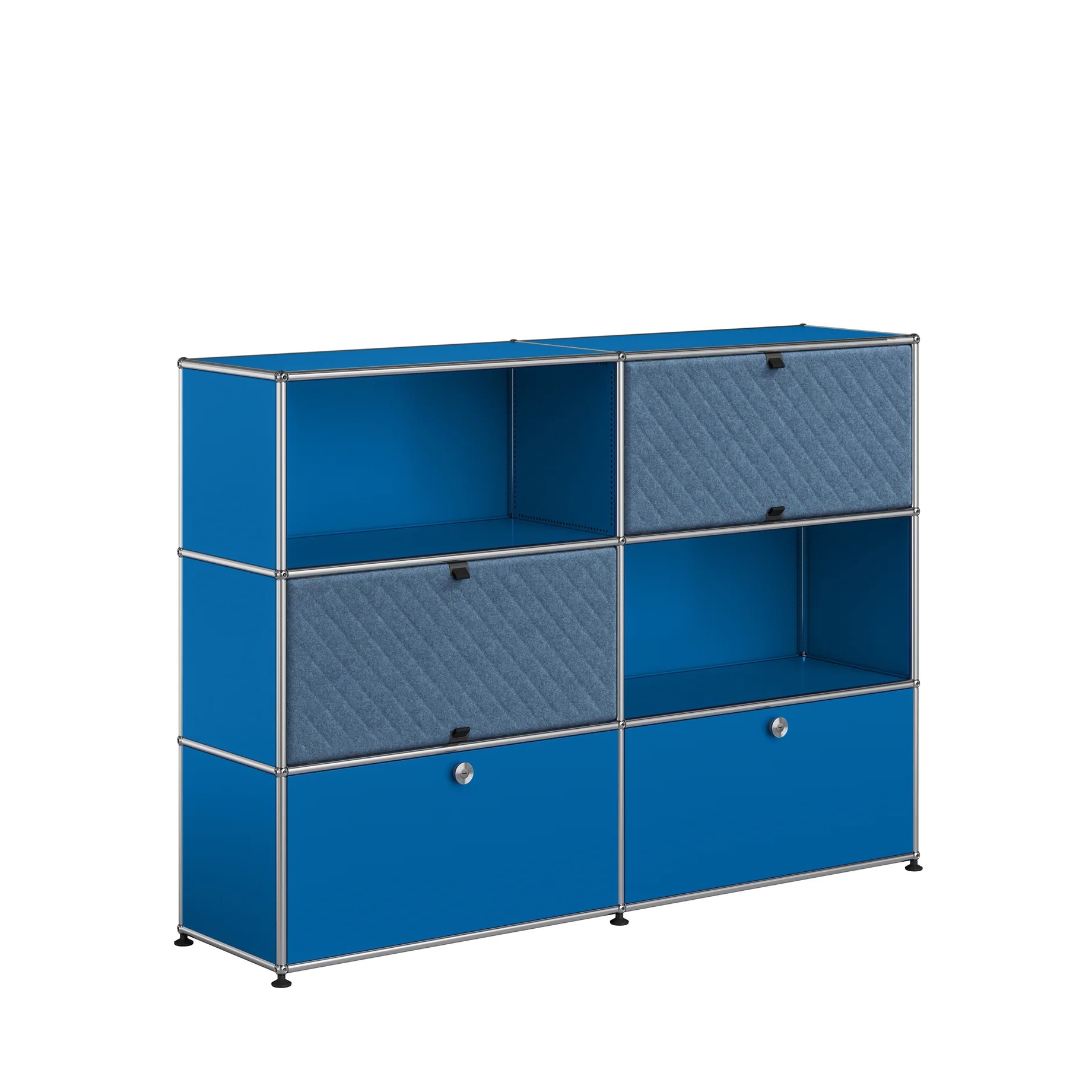 Meuble de rangement / buffet 6 modules : 2 caissons à portes métalliques, 2 caissons équipés de portes abattantes de type Soft Panels, 2 casiers ouverts (modulables). Créés par un architecte et un industriel visionnaires, les meubles USM sont fabriqués en Suisse depuis plus de 50 ans et reconnus dans le monde entier. Leur qualité de fabrication et leurs lignes intemporelles en font un classique incontournable du design, qui trouve sa place aussi bien dans les bureaux que dans les plus beaux intérieurs, classiques ou modernes. Leur conception modulaire permet de les faire évoluer au fil du temps selon les besoins et les envies.