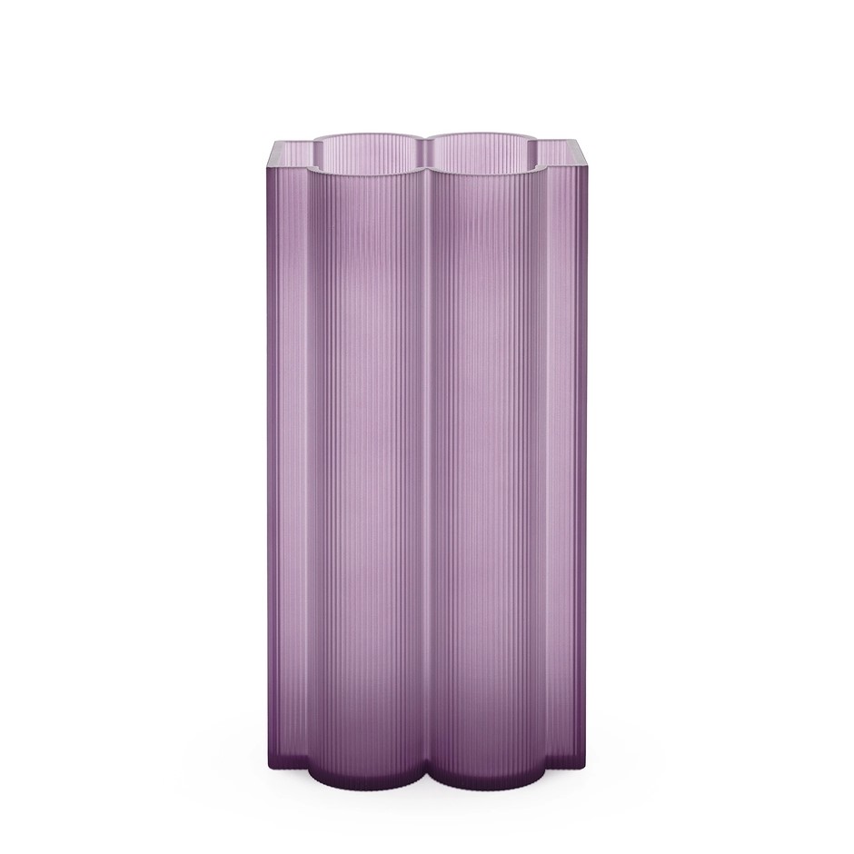 Modèle présenté : coloris VIOLET ; vase en PMMA recyclé. Compatible usage outdoor. Dimensions : L18 P18 H34 cm